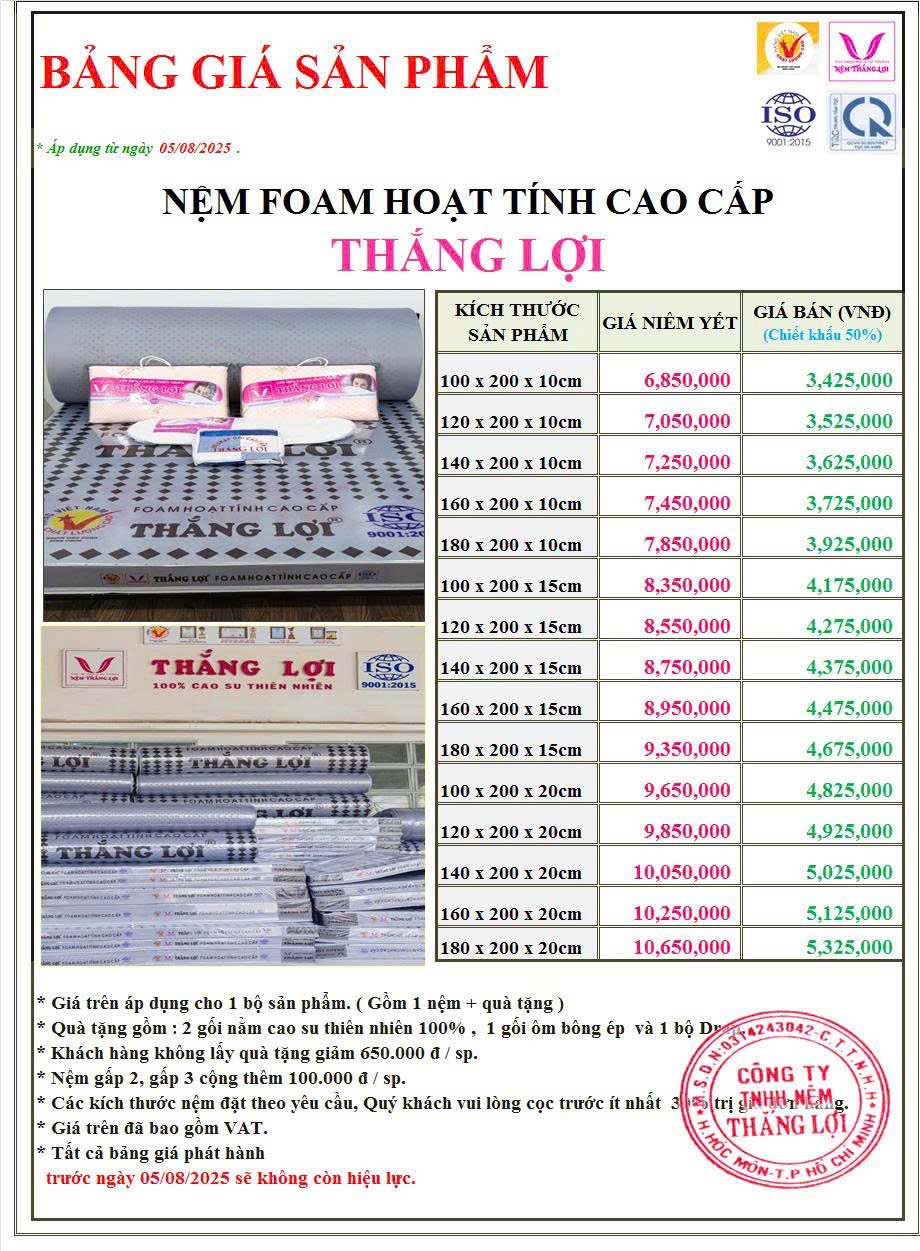 Bảng giá Nệm Foam Hoạt Tính Cao Cấp Thắng Lợi