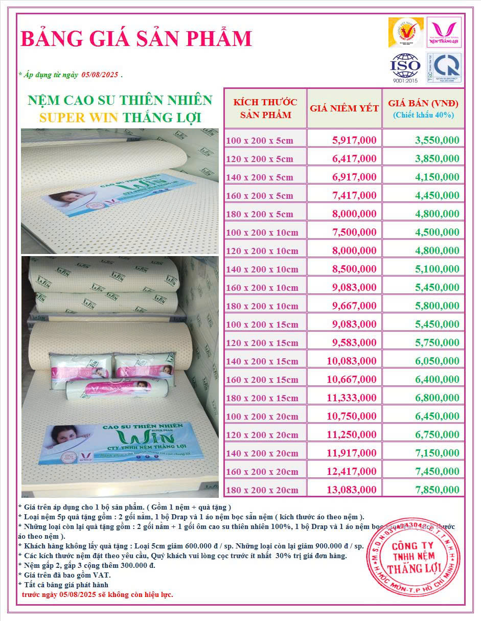 Bảng giá nệm Win Thiên Nhiên Thắng Lợi